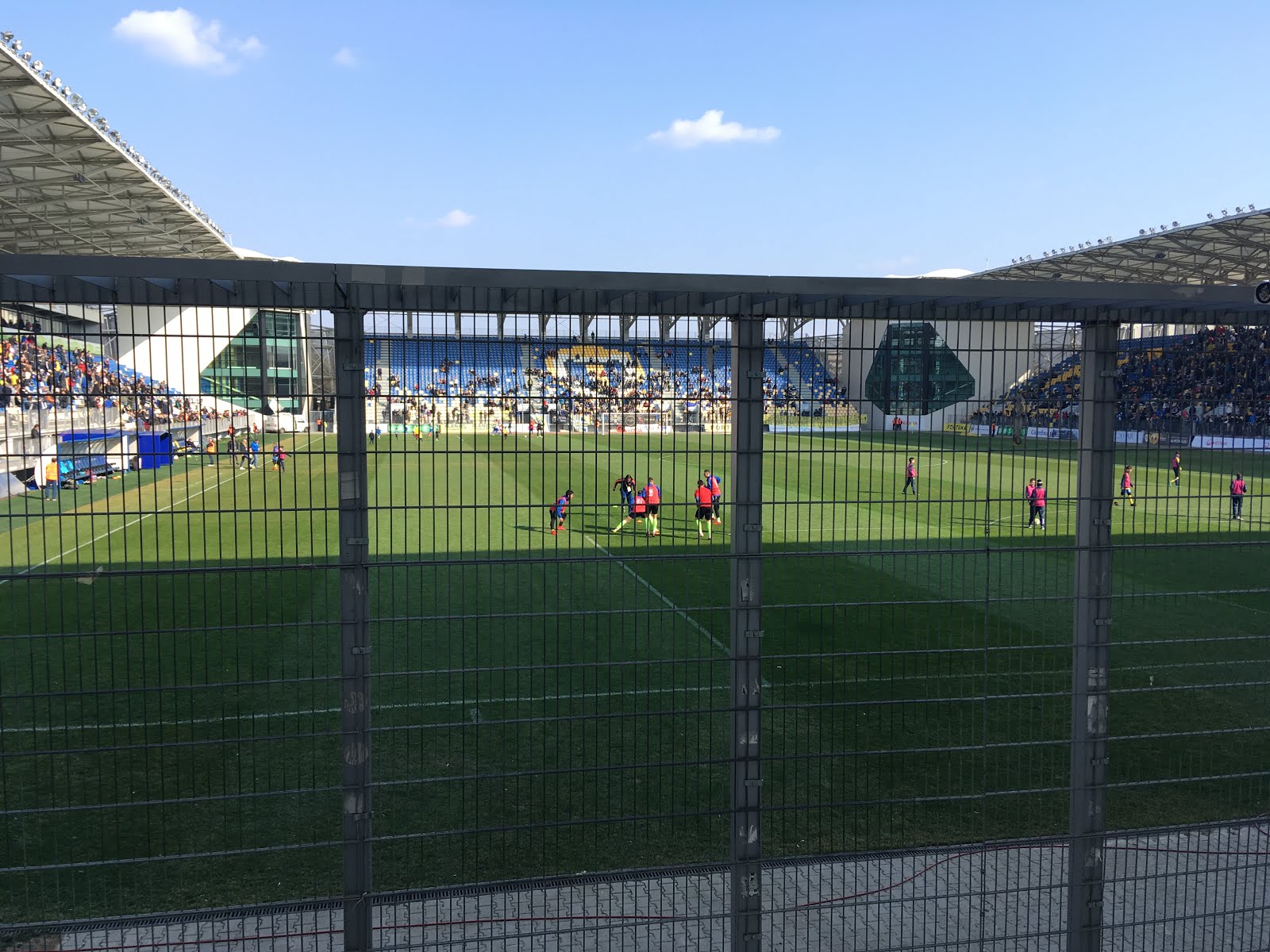 既に両チームのキーパーアップは始まっていましたが、13:20頃からMetaloglobus(写真奥)FPのアップ・13:25頃からPetrolul(写真手前)FPのアップが始まりました。屋根があるスタジアムだったので影の影響もあり肌寒さを感じましたが、絶好のサッカー日和だったと思います🙌